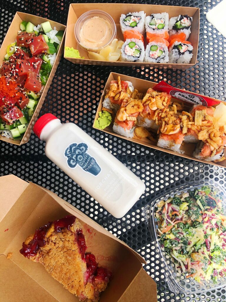 Poke bowl, shrimp tempura roll, another roll (it was some kind of salmon and crab roll), kale and broccoli slaw, housemade horchata (ridiculous) and cherry pie.