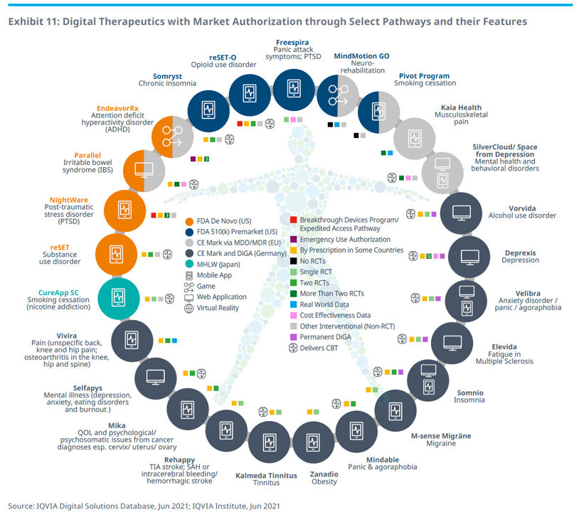 Health Populi’s Hot Points: The latest IQVIA report on digital health apps includes an in-depth analysis of regulatory pathways across countries. The digital therapeutics wheel shown here from IQVIA’s work illustrates some of the digital health tools with a lens on various national and regional regulatory regimes evaluating each of them.