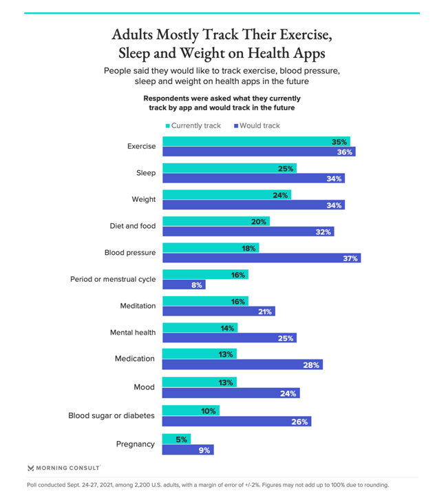 Looking to what people would like to track, blood pressure is first most in demand (for 37% of U.S. consumers), followed by exercise, sleep, weight, nutrition, and then new things like medication, mental health, mood, meditation, and blood sugar all attracting at least 1 in 5 new health tracking people.