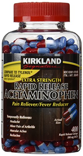 Kirkland Signature Extra Strength Rapid Release Pain Reliever Acetaminophen 500 MG 400 rapid release gelcaps Bottle By health | February 1, 2018 0 Comment Acetaminophen 500MG Rapid Release Gel capsTemporary relief of occasional headaches and minor aches and pains with accompanying sleeplessness.Rapid Release400 count