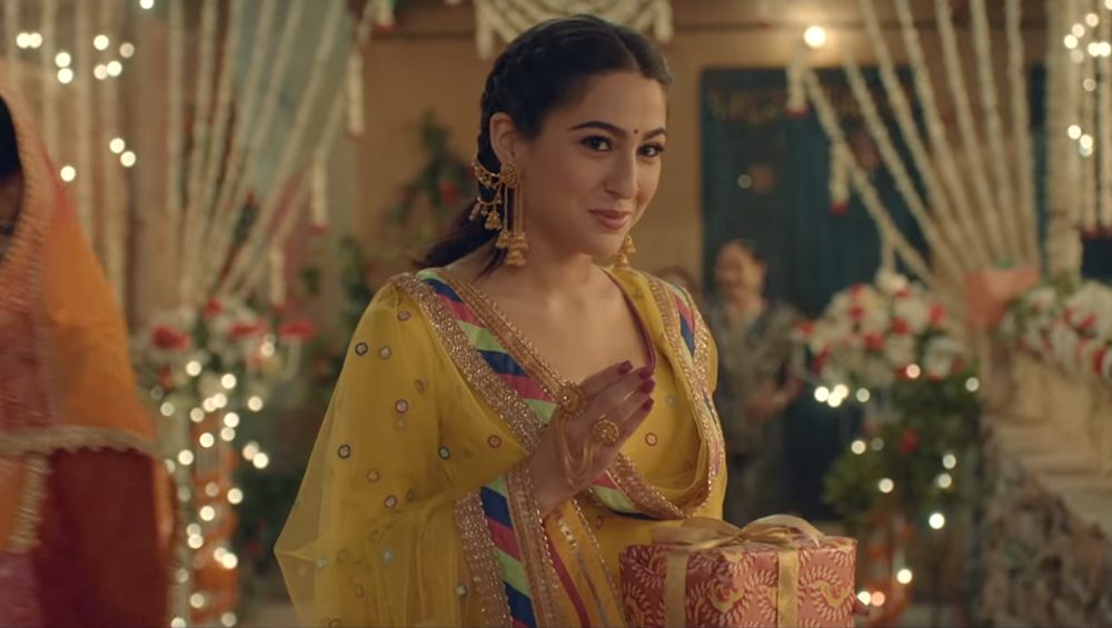 Sara is seen wearing vibrant colours like yellow and hues of orange. Her makeup is simple and neutral with focus being on the eyes and flushed cheeks. Her hair is styled in loose beach waves and has accessorised her look with oxidised jewellery and nath forms an important ornament of her look.