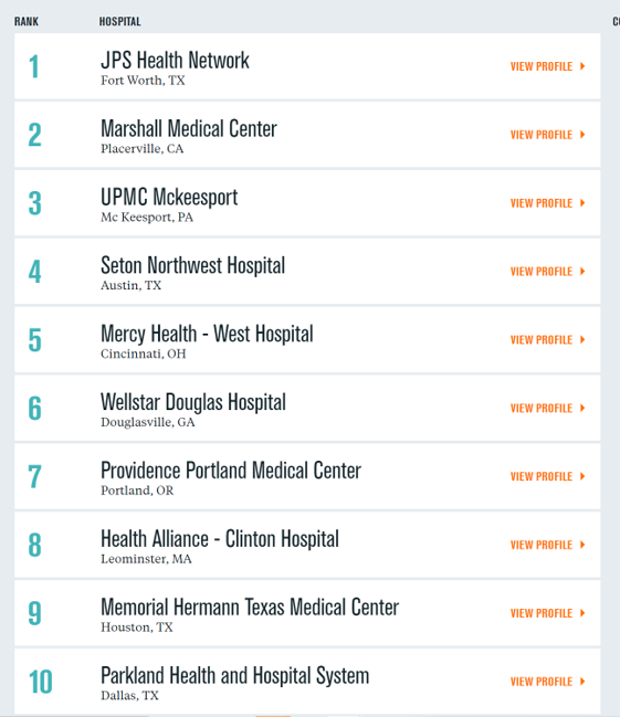 The top 10 hospitals live in California, Georgia, Massachusetts, Ohio, Oregon, Pennsylvania, and Texas…north, south, east, and west.