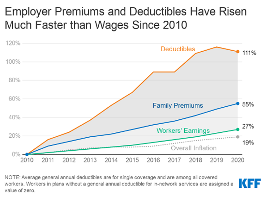 Even with that moderate increase, this post’s title reports the study headline that workers’ health insurance premiums continue to grow faster than wages: cumulatively since 2010, family premiums grew by 55% and deductibles, 11%. Workers’ earnings increased 27% in the period and inflation, 19%.